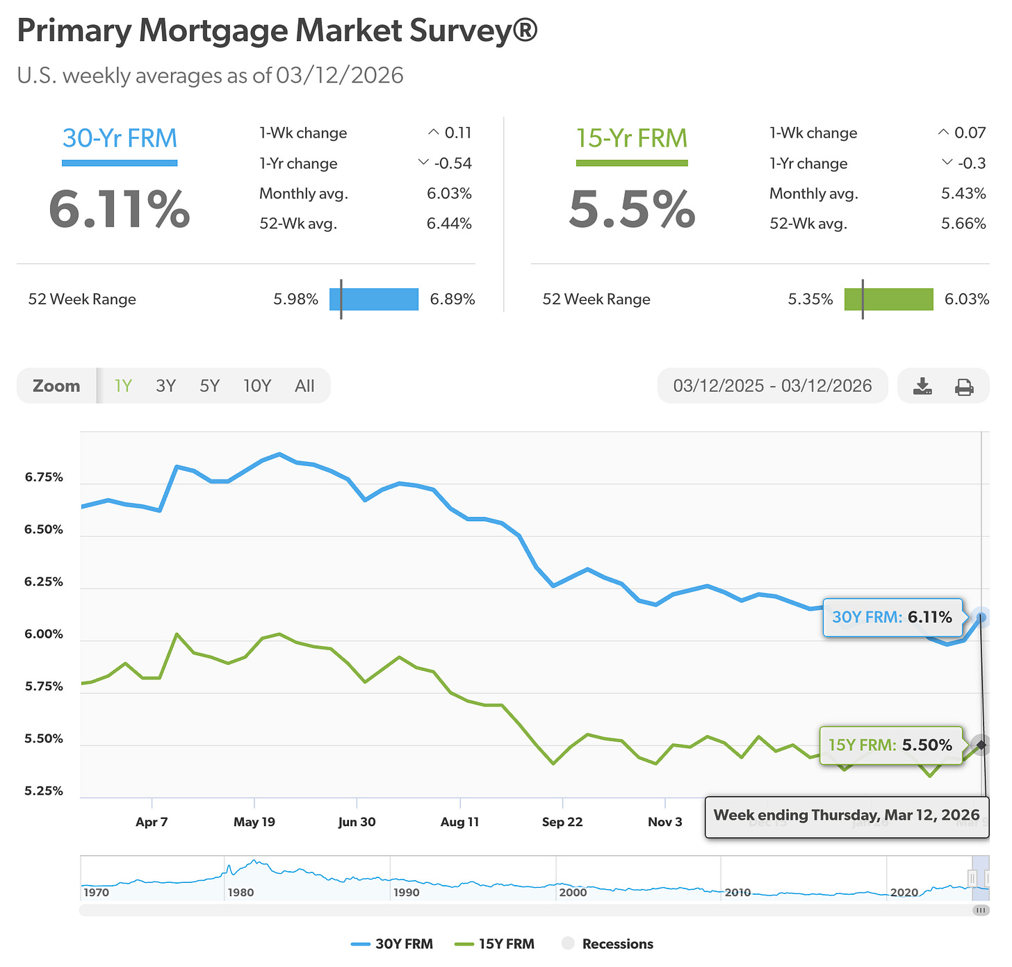 The 30-year fixed mortgage rate as of March 12, 2026, per the Freddie Mac Primary Mortgage Market Survey: 6.11% ↑. Up from 6.00% last week — returning to its level from a month prior. The 15-year fixed averaged 5.50% ↑, up from 5.43%.